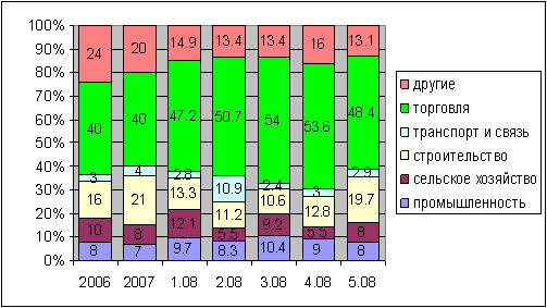 Рис. 4. Кредиты банков субъектам малого предпринимательства в разрезе отраслей, за 2006-2008 годы.