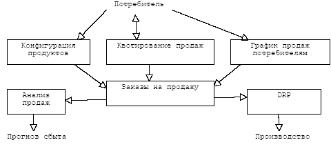 1.2.3. Управление сбытом Базовыми функциями этой подсистемы являются: 1) Sales Quotations - квотирование продаж; 2) Sales Orders / Invoices - заказы на продажу (счета фактуры); 3) Customer Schedules - график продаж потребителям; 4) Configured Products - конфигурирование продуктов; 5) Sales Analysis - анализ продаж; 6) Distributed Resource Planning (DRP) - управления ресурсами распределения.