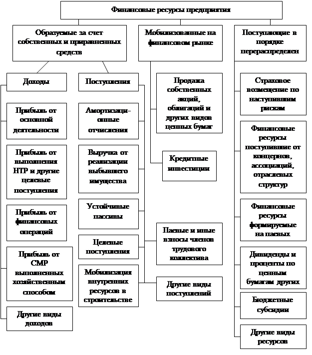 Источник: Поляк Г.Б. Финансовый менеджмент, с.121. Предложенная классификация строится на основании источников поступления финансовых ресурсов предприятия. Таким образом, можно сказать, что финансовые ресурсы предприятия образуются в результате производственно-хозяйственной деятельности хозяйствующих субъектов путем получения денег за проданные товары, производимые ими, а также мобилизации средств на финансовом рынке. Финансовые ресурсы фирмы - это часть денежных средств в форме доходов и внешних поступлений, предназначенных для выполнения финансовых обязательств и осуществления затрат по обеспечению расширенного воспроизводства. В процессе управления финансовой системой предприятия решаются вопросы получения финансовых ресурсов, управления финансовыми ресурсами и их использования. 1.2 Порядок формирования, распределение и использование финансовых ресурсов Основной целью формирования финансовых ресурсов предприятия является полное удовлетворение его финансовых потребностей, обеспечивающих предусмотренные темпы его устойчивого роста в предстоящем периоде. С учетом этой цели процесс формирования финансовых ресурсов предприятия строится на основе следующих принципов: 1. Учет перспектив развития хозяйственной деятельности предприятия. Процесс формирования объема и состава финансовых ресурсов предприятия подчинен целям обеспечения устойчивого его роста на всех этапах стратегического периода. Обеспечение этой перспективности формирования финансовых ресурсов предприятия достигается в процессе долгосрочного планирования их объема и состава. 2. Выделение в общем объеме финансовых ресурсов инвестиционной их части. Общая потребность в инвестиционных ресурсах предприятия основывается на расчетах объемов инвестирования, обеспечивающего реализацию как корпоративной его стратегии, так и функциональных его стратегий, а также стратегий отдельных бизнес-единиц. 3. Обеспечение оптимальной структуры источников формирования финансовых ресурсов с позиций финансовой безопасности предприятия. Оптимальная структура источников формирования финансовых ресурсов обеспечивает финансовое равновесие предприятия в процессе его стратегического развития. 4. Минимизация стоимости привлечения финансовых ресурсов по каждому из источников их формирования. Такая минимизация способствует снижению средневзвешенной стоимости капитала предприятия, а соответственно и росту уровня его финансовой рентабельности. Реализация этих принципов составляет основное содержание процесса управления формированием финансовых ресурсов предприятия в системе обеспечения его финансовой безопасности (42, с.51). Успешное развитие предприятия при прочих равных условиях зависит от мобилизации всех источников получения финансовых средств. Источники формирования средств предприятия представлены на рисунке 1.2.1. Из них наиболее важными для предприятия с точки зрения их величины и самостоятельности являются финансовые ресурсы, образуемые за счет собственных и приравненных к ним средств, а также заемные средства. При этом важно отметить, что каждый источник, приведенный на рисунке 1.2.1., характеризуется спецификой своего образования. Так, например, получение прибыли связано со многими обстоятельствами. Условно их можно разделить на чет