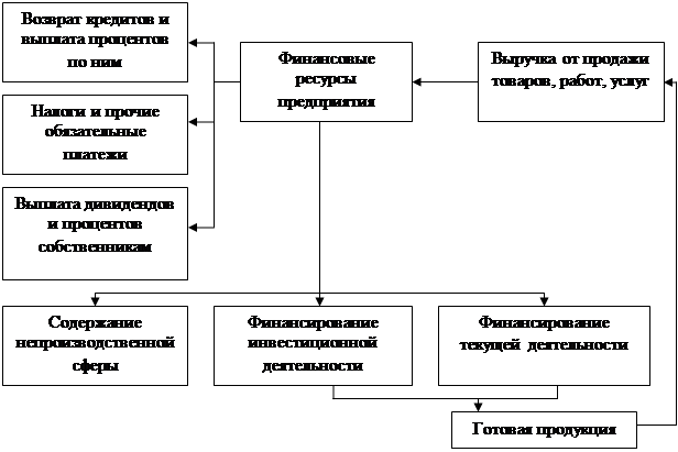 Рис. 1.2.2 - Распределение финансовых ресурсов предприятия Финансовые ресурсы предприятий направляются на следующие цели: - финансирование затрат на производство и реализацию продукции, работ, услуг; - реальные и финансовые инвестиции; - образование денежных фондов специального назначения; - платежей в бюджет и внебюджетные фонды; - погашение кредитов и ссуд; - благотворительные цели (51, с.425). Таким образом, можно сказать, что финансовые ресурсы по источникам образования подразделяются на собственные (внутренние) и привлеченные на разных условиях (внешние), мобилизуемые на финансовом рынке и поступающие в порядке перераспределения. Финансовые ресурсы используются предприятием в процессе производственной и инвестиционной деятельности, а основным направлением использования финансовых ресурсов предприятия является финансирование затрат на производство и реализацию продукции, работ, услуг.1.3 Методы управления финансовыми ресурсами предприятия Успешная деятельность предприятия не возможна без разумного управления финансовыми ресурсами. Нетрудно сформулировать цели для достижения которых необходимо рациональное управление финансовыми ресурсами: - выживание фирмы в условиях конкурентной борьбы; - избежание банкротства и крупных финансовых неудач; - лидерство в борьбе с конкурентами; - максимизация рыночной стоимости фирмы; - приемлемые темпы роста экономического потенциала фирмы; - рост объемов производства и реализации; - максимизация прибыли; - минимизация расходов; - обеспечение рентабельной деятельности и т.д. Приоритетность той или иной цели может выбираться предприятием в зависимости от отрасли, положения на данном сегменте рынка и от многого другого, но удачное продвижение к выбранной цели во многом зависит от совершенства управления финансовыми ресурсами предприятия (11, с.37). Таким образом, управление финансовыми ресурсами представляет собой часть общей финансовой стратегии предприятия, заключающаяся в обеспечении необходимого уровня финансирования его производственного развития. Управление финансовыми ресурсами предприятия осуществляется по следующим основным этапам. На первом этапе изучается общий объем формирования финансовых ресурсов, соответствие темпов прироста собственного и заемного капиталов темпам прироста имущества и объема реализуемой продукции предприятия, динамика удельного веса собственных и заемных ресурсов в общем объеме формирования финансовых ресурсов в предплановом периоде. На втором этапе анализа рассматриваются источники формирования финансовых ресурсов. В первую очередь изучается соотношение внешних и внутренних источников формирования финансовых ресурсов, а также стоимость привлечения собственного и заемного капиталов за счет различных источников. На третьем этапе анализа оценивается достаточность финансовых ресурсов, сформированных на предприятии в отчетном периоде. На четвертом этапе, проводится оптимизация соотношения внутренних и внешних источников формирования собственных и заемных финансовых ресурсов (24, с.193). Основными методами, связанными с оценкой и последующим управлением финансовыми ресурсами являются методы экономического анализа и в частности финансовый анализ. На основании финансового анализа текущего состояния ресурсов предприятия прово