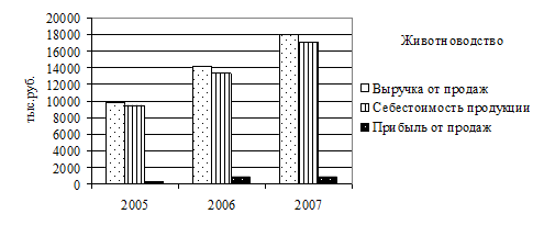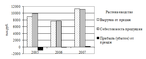 Источник: Финансовая отчетность СПК «Луч» за 2006-2007 гг. Анализ полученных в таблице 2.1.2 данных показал, что в 2006 г. объем продаж продукции растениеводства хуже, чем в 2007 г., при этом себестоимость в 2005 и 2006 гг. выше, чем полученная выручка, в следствии чего, растениеводство было убыточным для СПК «Луч» в 2005 и 2006 гг. В 2007 г. ситуация изменилась и предприятие получило прибыль от продаж, что вызвано в первую очередь улучшением технологического процесса производства (закуплены новые трактора с меньшими затратами на ГСМ и были приобретены новые сорта зерновых культур, урожайность которых на 35% выше ранее используемых). Животноводство же за все три года приносило прибыль от продаж, при этом объемы финансовых результатов постоянно возрастали, что вызвано постоянным повышением технического и технологического процесса производства, так например закупка нового оборудования (сепараторов) позволило увеличить объем перерабатываемого молока, а приобретение КРС голландской породы позволило повысить не только количество, но и качество продукции. Для наглядности построим график отражающий динамику финансовых результатов деятельности СПК «Луч» за 2005-2007 гг. по видам деятельности (рис. 2.1.3. и 2.1.4.)