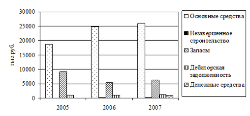 Источник: собственные расчеты на основании финансовой отчетности СПК «Луч» за 2006-2007 гг. Для наглядности построим график динамики структуры имущества СПК «Луч» за 2005-2007 гг. (рис. 2.3.3.).