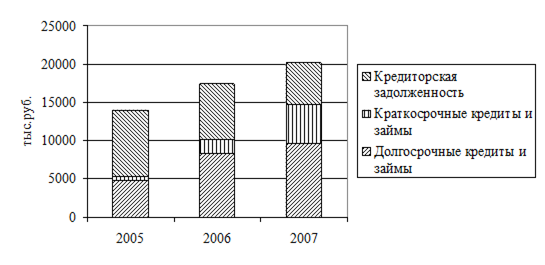Рис. 2.2.3 - Динамика структуры имущества СПК «Луч» за 2005-2007 гг. Таким образом, можно сказать, что финансовые ресурсы СПК «Луч», как собственные, так и заемные идут на формирование имущества предприятия. При этом объем имущества постоянно увеличивается, что связано с приобретением нового оборудования и развитием инфраструктуры СПК «Луч». Обобщая все вышеизложенное можно сказать, что собственными финансовыми ресурсами СПК «Луч» являются: собственный капитал и амортизационные отчисления. Анализ же собственного капитала СПК «Луч» показал его постоянное увеличение, но при этом удельный вес его в структуре валюты баланса предприятия сокращается, что указывает на повышение финансовой зависимости предприятия. Объем амортизационных отчислений, так же постоянно увеличивается, что связано с приобретением нового дорогостоящего оборудования 2.3 Управления заемными финансовыми ресурсами СПК «Луч» Финансовые ресурсы по источникам образования подразделяются на собственные (внутренние) и привлеченные на разных условиях (внешние), мобилизуемые на финансовом рынке и поступающие в порядке перераспределения. Заемные финансовые ресурсы характеризуют привлекаемый предприятием капитал во всех его формах на возвратной основе. Все формы заемных финансовых ресурсов, формируемых предприятием для осуществления предстоящей хозяйственной деятельности, представляют собой его финансовые обязательства, подлежащие погашению в предусмотренные сроки. Заемный капитал, используемый предприятием, характеризует в совокупности объем его финансовый обязательств (общую сумму долга). Эти финансовые обязательства в современной хозяйственной практике дифференцируются следующим образом: 1. Долгосрочные финансовые обязательства. К ним относятся все формы функционирующего на предприятии заемного капитала со сроком его использования более одного года. Основными формами этих обязательств являются долгосрочные кредиты банков и долгосрочные заемные средства (задолженность по эмитированным облигациям, задолженность по финансовой помощи, предоставленной на возвратной основе и т.п.), срок погашения которых еще не наступил или не погашенные в предусмотренный срок. 2. Краткосрочные финансовые обязательства. К ним относятся все формы привлеченного заемного капитала со сроком его использования до одного года. Основными формами этих обязательств являются краткосрочные кресты банков и краткосрочные заемные средства, различные формы кредиторской задолженности предприятия (по товарам, работам и услугам; по расчетам с бюджетом и внебюджетными фондами; по оплате труда; с другими кредиторами) и другие краткосрочные финансовые обязательства. Политика привлечения заемных средств представляет собой часть общей финансовой стратегии, заключающейся в обеспечении наиболее эффективных форм и условий привлечения заемного капитала из различных источников в соответствии с потребностями развития предприятия (12, с.94). Проведем анализ структуры формирования заемных финансовых ресурсов СПК «Луч» за 2005-2007 гг. на основании данных бухгалтерской отчетности, а точнее IV и V раздела баланса (таблица 2.3.1.) Таблица 2.3.1 - Анализ структуры формирования заемных финансовых ресурсов СПК «Луч» за 2005-2007 гг.