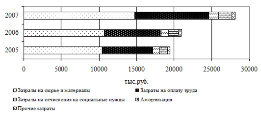 Рис. 2.3.2 - Динамика и структура поступивших субсидий на СПК «Луч» за 2005-2007 гг. Как говорилось в параграфе 2.2. финансовые ресурсы СПК «Луч», как собственные, так и заемные идут на формирование имущества предприятия. Однако это не единственное направление использования, как собственных, так и заемных средств. Большое количество получаемых предприятием средств направляется на покрытие затрат связанных с производственным процессом. Проведем анализ затрат в структуре себестоимости СПК «Луч» за 2005-2007 гг. (таблица 2.3.3.). Таблица 2.3.3 - Динамика затрат в структуре себестоимости СПК «Луч» за 2005-2007 гг.
