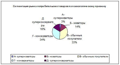Рис. 3. Схема классификации по методу АID [9] I . II . Методы сегментации рынка Можно выделить некоторые "базовые" методы сегментирования. Важнейшим из них является кластерный анализ потребителей (таксономия). Кластеры потребителей формируются объединением в группу тех, кто дает сходные ответы на заданные вопросы. Покупатели могут быть объединены в кластер, если они имеют сходный возраст, доход, привычки и т.п. Сходство между покупателями основывается на разных измерителях, но часто в качестве меры сходства используется взвешенная сумела квадрата различий между ответами покупателей на вопрос. Выходом алгоритмов кластеризации могут быть иерархические деревья или объединение потребителей в группы. Существует достаточно большое количество кластерных алгоритмов. [10] Например, в США широко распространен кластерный анализ систем, называемый PRIZM, который начинает кластеризацию, сокращая набор из 1000 возможных социально-демографических показателей. Данная система формирует социально-демографические сегменты для всей территории CШA. Так, выделен кластер 28 - семьи, которые попали в этот кластер, включают лиц с наиболее успешной профессиональной или управленческой карьерой. Этот кластер также отражает высокий доход, образование, собственность, приблизительно средний возраст. Хотя данный кластер представляет только 7% населения США, он является критическим для предпринимателей, продающих дорогие товары. Существуют другие примеры сегментации потребителей на основе кластерного анализа. Например, среди "психологических" секторов весьма важное место Рис. 4. Диаграма сегментации рынка потребительских