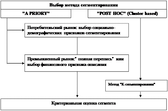 *** - очень важный фактор ** - важный фактор * - маловажный фактор 0 - незначительный фактор Этот несложный анализ показывает , что модель А - компьютер без рынка, а модель В - наиболее подходящий продукт для университетов и мелкого бизнеса. Компания в свое время поставила на компьютер А и проиграла. Вообще, в мировой практике используются 2 принципиальных подхода к маркетинговому сегментированию Рис. 5. Схема выбора метода сегментации[14]