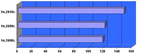 Рисунок 5 – Количество дел о несостоятельности (банкротстве), в 2008-2010гг В отчётном периоде поступило 199 заявлений о признании должника банкротом, из них заявлений от должника - 47, от кредитора - 48, от уполномоченных органов - 104.