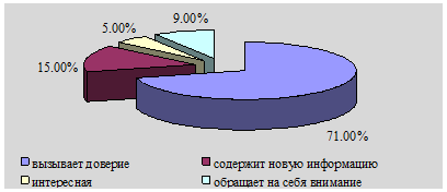 Рис.9. Общая оценка рекламы (ответ на вопрос 4 анкеты) Важно отметить, что "интересной" рекламу посчитали лишь 5%, респондентов, также лишь небольшое количество (9%) опрашиваемых указало, что реклама обращает на себя внимание, следовательно, степень яркости и художественной привлекательности рекламы едва ли можно оценить как "хорошую". В то же время в содержательном плане реклама заинтересовывает в достаточно высокой степени (71%), что в свою очередь вызывает и укрепляет желание воспользоваться рекламируемым товаром. Следовательно, результаты оценки по пятибальной системе основных параметров психологической эффективности рекламы бара ООО "Тимур" выглядят следующим образом: 1. Способность рекламной визитки привлечь внимание - 2 балла. 2. Способность заинтересовать - 5 баллов. 3. Способность вызвать желание воспользоваться рекламируемым товаром - 4 балла. Проведенный анализ позволяет отнести проанализированную рекламную продукцию (рекламные визитки бара ООО "Тимур") к 4-му рангу психологической эффективности, согласно которому: " (ранг 4) реклама привлекает внимание потребителя, вызывает его интерес, однако в недостаточной степени удовлетворяет его. Потребитель запоминает рекламу, однако вовсе не готов в обязательном порядке воспользоваться предлагаемым продуктом". Таким образом, ООО "Тимур" необходимо повысить психологическую. эффективность печатной рекламы, усилить ее когнитивный, эмоциональный и поведенческий компонент рекламного воздействия. При этом когнитивный компонент описывает то, как реклама воспринимается, насколько хорошо запоминается ее содержание. Эмоциональный компонент определяет отношение человека к рекламе, то есть те чувства и эмоции, которые он испытывает при восприятии рекламного продукта. Поведенческий компонент определяет способ действия человека под влиянием рекламы, его выбор, будет или не будет он приобретать рекламируемый товар или услугу. Решение проблемы повышения эффективности рекламы организации тесно взаимосвязано с усовершенствованием процесса выбора средств распространения рекламы в баре. Так, при выборе средств распространения рекламы ООО "Тимур" необходимо учитывать ряд факторов, к основным из которых относят: цели, соответствие средства распространения рекламы характеру целевой аудитории, рекламную деятельность конкурентов, наличие соответствующих средств, возможность пользоваться определенными средствами распространения информации и т.д. На этапе выбора средств распространения рекламной информации необходимо также принятие решений о следующих параметрах рекламы: охват (количество людей, ознакомленных с рекламным обращением за определенный период); частота (среднее число фактов воздействия какого-либо рекламного обращения на отдельных лиц или сегменты за определенный промежуток времени); сила воздействия (эффект, который реклама производит на среднего представителя целевой аудитории). Как показало исследование, ряд публикаций в СМИ "дублировали" свое воздействие, либо были нацелены во многом на "ненужные" аудитории. Так, на наш взгляд, ООО "Тимур" не стоит давать рекламу в нескольких туристических газетах одновременно, чья целевая аудитория практически идентична. Достаточно выбрать одну из них. В то же время необходимо сохранить рекламу в газете "Ва-банкъ", которая ра