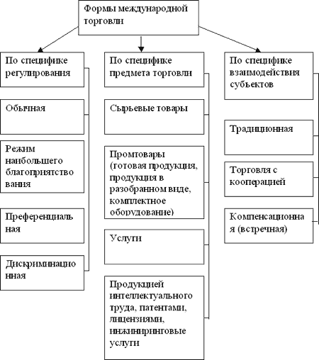 Теоретики международной торговли приводят такую типизацию международной кооперации: 1. По количеству предметов однопредметная; многопредметная; 2. По количеству сторон двухсторонняя; многосторонняя; 3. По территориальному охвату локальная; региональная; межрегиональная; глобальная; 4. По стадиям процесса производственная; коммерческая; 5. По структуре связей внутрифирменная; внутриотраслевая; межотраслевая; горизонтальная; вертикальная; смешанная; 6. По организационной форме договорная; совместные программы; совместное предприятие; 7. По объектам связей производственная; научно-техническая; сбытовая; маркетинговая; промышленное сотрудничество. Торговля в сочетании с кооперацией предусматривает заключение контрактов связывающих производственные процессы независимых фирм. В зависимости от степени интеграции различают производственную, сбытовую, производственно-сбытовую и торговлю в составе консорциумов. Популярной разновидностью международной торговли в последнее время стала компенсационная торговля в форме товарообменной (бартерной торговли), встречной торговли в виде обратной закупки продукции или компенсационных соглашений. Последние могут заключаться в виде: собственно, компенсационных соглашений, обратной закупки, соглашения, предусматривающие возмещение. Говоря о регулировании мирового рынка сырья, необходимо отметить, что оно происходит двумя методами это заключение международных товарных соглашений (Маракерское соглашение по созданию Мировой организации торговли) с учетом программ развития, стабилизации, административного управления и создание международных отраслевых организаций, как например объединений стран экспортеров нефти (ОПЕК). |