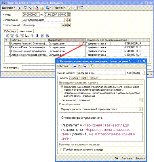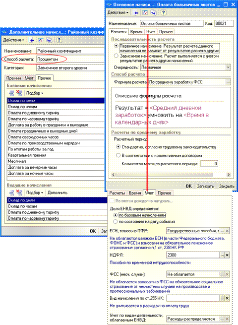 Если в результате кадровых перестановок график работы работника изменяется, то такие события должны быть документально зарегистрированы в информационной базе. Специально вести учет отработанного времени не потребуется. Фактически отработанное время будет вычисляться как объем планового времени, которое должен был отработать работник согласно графику, минус документально зафиксированные отклонения от этого графика, когда в указанное в графике рабочее время работник отсутствовал, например, по причине отпуска или болезни. При сдельной оплате труда для расчета суммы заработка необходимо ежемесячно регистрировать фактическую выработку работника специальными документами — сдельными нарядами. Но график работы также требуется указывать, поскольку он используется в некоторых других расчетах. Учет рабочего времениИспользуемые для учета отработанного времени графики работы могут быть следующих типов: пятидневные, шестидневные, сменные и, кроме того, индивидуальные. В конфигурации необходимо указывать продолжительность рабочей недели и часы рабочего времени: интервалы работы в течение рабочего дня или смены с исключением перерыва на обед. Например, для 40–часовой рабочей недели и пятидневного графика работы часы рабочего времени могут быть такими: с 8-00 до 12-00 и с 13-00 до 17-00 (здесь предполагается, что перерыв на обед занимает время с 12-00 до 13-00). В конфигурации поддерживаются графики суммированного учета рабочего времени, а также графики сокращенного рабочего времени. Предусмотрено автоматическое заполнение текущего календаря графика работы с учетом общегосударственных праздников, в котором отражаются рабочие дни, укороченные предпраздничные дни и перенесенные дни отдыха. Список общегосударственных праздников также хранится в информационной базе. Предусмотрена возможность ввода подробных и/или сводных табелей учета рабочего времени, как первичных документов, данные которых используются далее при начислении зарплаты; в этом случае отработанное время определяется по данным табеля, существующие же графики работы будут использованы только для определения нормативного количества рабочего времени. При формировании табеля учета отработанного времени по форме Т-13 в условиях отсутствия данных о расчетах заработной платы используются данные об отсутствии работников, зарегистрированные в «кадровом» контуре учета. Начисления и удержанияВсе начисления организации объединены в две большие группы: · Основные начисления — это начисления, характеризующиеся продолжительностью во времени, т.е. имеющие период действия (оплата по тарифным ставкам, оплата периодов отсутствия работника и пр.). · Дополнительные начисления — это начисления, характеризующиеся одной датой начисления, например премии или дивиденды. Эти начисления, тем не менее, могут рассчитываться на основании сумм, ранее начисленных по основным начислениям.