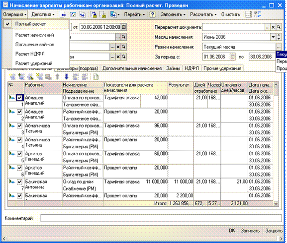 Каждый вид начислений характеризуется способом расчета и другими параметрами. Конфигурация содержит достаточный набор предопределенных видов начислений и удержаний. В частности, предусмотрены начисления по нескольким видам отпусков и нескольким видам простоев в рабочее время, удержания алиментов и др. Но пользователи могут добавлять неограниченное количество собственных видов начислений и удержаний со всеми предусмотренными в конфигурации способами расчета для начислений (удержаний). Основные начисления могут рассчитываться следующими способами: · по тарифной ставке (месячной, дневной или часовой) за фактический период действия начисления; · сдельно за фактический период действия начисления; · процентом (от сумм, начисленных по указанным базовым начислениям); · фиксированной суммой; · по среднему заработку для отпуска по календарным дням; · по среднему заработку для отпуска при расчете из рабочих дней; · по среднему заработку для исчисления пособий по временной нетрудоспособности; · по среднему заработку (например, для оплаты командировок); · доплата до среднего заработка; · как пособие по уходу за ребенком до 1,5 лет; · как пособие по уходу за ребенком до 3-х лет и др. Дополнительные начисления могут рассчитываться следующими способами: · процентом (от сумм, начисленных по указанным базовым начислениям); · фиксированной суммой. Удержания могут рассчитываться следующими способами: · процентом (от сумм, начисленных по указанным базовым начислениям); · для удержания по исполнительным документам (т.е. с предварительным уменьшением суммы базовых начислений на сумму налогов); · фиксированной суммой. Можно указать, что основное или дополнительное начисление являются доходами в натуральной форме. К доходам в натуральной форме, например, относятся проездные билеты, выдаваемые работникам предприятия. Доходы в натуральной форме отличаются от доходов в денежной формы тем, что они не учитываются в денежных взаиморасчетах с работниками. Процедура расчета зарплатыПосле ввода в информационную базу сведений о текущей выработке работников, об отклонениях от графика работы (в том числе почасовых невыходов), о разовых начислениях и удержаниях можно произвести собственно расчет заработной платы и связанных с ней начислений. Для расчета зарплаты используется документ «Начисление зарплаты работникам организаций».