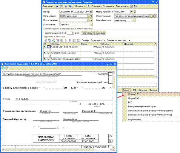Документ формируется и заполняется автоматизированным образом. В документе предусмотрена возможность регистрации выплаты зарплаты через кассу организации, а также путем безналичного перечисления зарплаты на счета работников в банке. Конфигурация обеспечивает формирование всех бумажных печатных форм, связанных с начислением и выплатой зарплаты: расчетных листков, платежных ведомостей и др. Для организаций, где не принято использовать общую платежную ведомость для регистрации выплат заработной платы, предусмотрен механизм группового формирования расходных кассовых ордеров (по одному на каждого работника) непосредственно из формы документа. Дополнительно поддерживается возможность автоматически передать информацию о созданных РКО в информационную базу конфигурации «Бухгалтерия предприятия». Конфигурация содержит необходимые средства для учета депонированной заработной платы. Перечисление зарплаты на карточные счета работниковДля распределения зарплаты, перечисленной в банк, по карточным счетам работников, предлагается специальный механизм обмена информацией, разработанный фирмой «1С» совместно со Сбербанком РФ. Обмен данными о перечисляемых суммах заработной платы происходит с помощью файлов формата XML. Для считывания информации из полученного файла, для формирования файла, предназначенного к отправке в банк, в конфигурации "Зарплата и Управление Персоналом" используется специальная обработка.