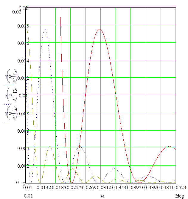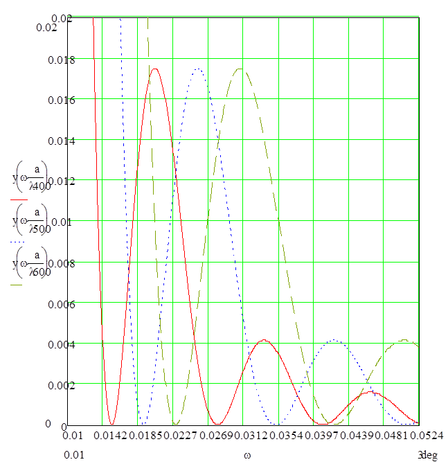 Таблица 5.1 - Корни уравнения J1(x) = J2(x) = 0 На рис.3. приложения представлено семейство характеристик, описывающих конкретный случай, при a – const (a = 0.1·10-3 м) и различных длинах волн λ (400 нм, 500 нм, 600 нм). Из графика видно, что угловой радиус ω прямо пропорционален длине волны падающего света. На рис.4. приложения представлено семейство характеристик, описывающих конкретный случай, при λ – const (λ = 600·10-9 м) и различных радиусах отверстий a (1·10-4 м, 2·10-4 м, 3·10-4 м). Из графика видно, что угловой радиус ω обратно пропорционален радиусу отверстия. При увеличении радиуса отверстия характеристика принимает более резкий характер. 6. ВЫВОДЫ В данном курсовом проекте была изучена функция распределения интенсивности света Найденные результаты показывают, что наблюдаемая картина имеет вид светлого диска с центром в геометрическом изображении источника (p = 0, q = 0), окруженного светлыми и темными кольцами. Интенсивность светлых колец быстро уменьшается с увеличением радиуса и обычно только одно или два первых кольца достаточно ярки, чтобы их можно было наблюдать невооруженным глазом. 7. ЗАКЛЮЧЕНИЕ Поставленная задача была решена, используя классические методы расчета, основанные на хорошо зарекомендовавших себя функциях Бесселя. Случай дифракции параллельных световых волн на круглом отверстии имеет большое практическое значение, поскольку все оправы линз и объективов имеют обычно круглую форму, так что при расчете любого оптического инструмента приходится принимать в расчет дифракцию света на оправах линз. СПИСОК ЛИТЕРАТУРЫ 1. Борн М., Вольф Э. Основы оптики. –М.: Наука, 1970. – 856 с. 2. Ландсберг Г.С. Оптика. –М.: Наука, 1976. – 928 с. 3. Орловская Л.В. Изучение дифракции лазерного излучения от круглого отверстия. –Томск, 1985. – 10 с. (Ротапринт ТИАСУРа). ПРИЛОЖЕНИЕ 1