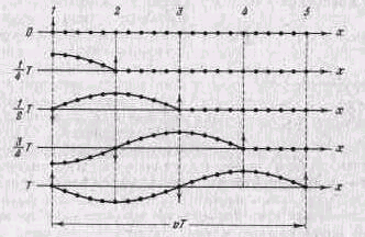 На рис. 1 показано движение частиц при распространении в среде поперечной волны. Номерами 1, 2 и т. д. обозначены частицы, отстоящие друг от друга на расстояние, равное 1/4 vТ , т. е. на расстояние, проходимое волной за четверть периода колебаний, совершаемых частицами. В момент времени, принятый за нулевой, волна, распространяясь вдоль оси слева направо, достигла частицы 1, вследствие чего частица начала смещаться из положения равновесия вверх, увлекая за собой следующие частицы. Спустя четверть периода частица 1 достигает крайнего верхнего положения; одновременно начинает смещаться из положения равновесия частица 2. По прошествии еще четверти периода первая частица будет проходить положение равновесия, двигаясь в направлении сверху вниз, вторая частица достигнет крайнего верхнего положения, а третья частица начнет смещаться вверх из положения равновесия. В момент времени, равный Т, первая частица закончит полный цикл колебания и будет находиться в таком же состоянии движения, как и в начальный момент. Волна к моменту времени T, пройдя путь vТ, достигнет частицы 5. На рис. 2 показано движение частиц при распространении в среде продольной волны. Все рассуждения, касающиеся поведения частиц в поперечной волне, могут быть отнесены и к данному случаю с заменой смещений вверх и вниз смещениями вправо и влево. Из рисунка видно, что при распространении продольной волны в среде создаются чередующиеся сгущения и разрежения частиц (места сгущения частиц обведены на рисунке пунктиром), перемещающиеся в направлении распространения волны со скоростью v.