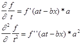 Глава II. Волновое уравнение. § 1. Математические сведения. Этот параграф является математическим введением к тому динамическому рассмотрению волн, которое будет дано в $2. Рассмотрим произвольную функцию f(at-bx) (2.3) от аргумента а t— bх. Продифференцируем ее дважды по t: