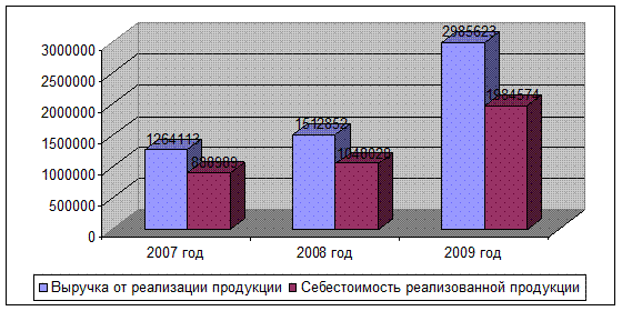 Рисунок 3 - Динамика дохода от реализации и себестоимости АО «Кокшетауские минеральные воды» Как видно из вышеприведенного рисунка, за период с 2007 года по 2009 год наблюдается увеличение дохода от реализации продукции и оказания услуг с 1264113 тыс. тенге в 2007 году до 1512852 тыс. тенге в 2008 году и 2985623 тыс. тенге в 2009 году. Что является положительной тенденцией в деятельности хозяйствующего субъекта и говорит об эффективности его деятельности. Положительную динамику демонстрирует и себестоимость реализованной продукции и оказанных услуг. Так если в 2007 году величина себестоимости составляла 888989 тыс. тенге, то в 2008 году она увеличилась до 1048026 тыс. тенге, или на 18 %. В 2009 году величина себестоимости составила 1984574 тыс.тенге.