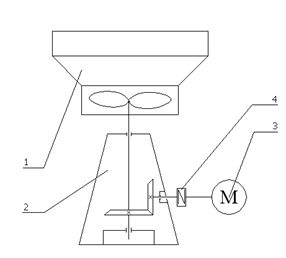 Рисунок 6 1 – аппарат воздушного охлаждения; 2 – конический редуктор-опора; 3 – электродвигатель; 4 – муфта Для привода АВГ выбираем стандартный редуктор-опору [4, с. 45], основные размеры которого приведены на рисунке 7. Передаточное отношение для аппарата АВГ составляет 2,27 [4, с. 44], скорость вращения входного вала n1 = 480 с-1 , тогда скорость вращения выходного вала и вентилятора: n2 = n1 / i, (131) где i = 2,27 – передаточное отношение, n2 = 480/ 2,27=211,45 с-1