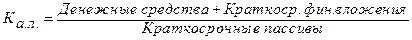 Нормальное значение этого коэффициента в значительной степени зависит от отраслевой принадлежности предприятия. Поскольку длительность производственного цикла небольшая, предприятию необязательно обладать высокой текущей ликвидностью. Но вместе с тем, значение коэффициента текущей ликвидности ниже единицы (показатель за 2009 год: 0,754) говорит о недостаточной платежеспособности предприятия. Коэффициент быстрой ликвидности Коэффициент быстрой ликвидности, или коэффициент «критической оценки», показывает, насколько ликвидные средства предприятия покрывают его краткосрочную задолженность. Коэффициент быстрой ликвидности определяется по формуле: