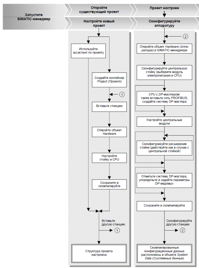 Запустите программу SIMATIC-менеджер (SIMATIC Manager) и настройте новый проект (начните разработку нового проекта) или откройте существующий. В проекте все данные для задачи автоматизации хранятся в форме объектов. При настройке проекта вы создаете контейнеры для аккумулируемых данных путем установки требуемых станций, содержащих, по крайней мере, CPU; затем также создаются контейнеры для пользовательских программ. Также вы можете создать программный контейнер непосредственно в проекте. На следующих этапах вы конфигурируете аппаратные средства и, если требуется, коммуникационные соединения. Затем вы создаете и тестируете программу. Порядок создания данных автоматизации не жесткий. Применяются лишь следующие установки: если вы хотите обработать объекты (данные), они должны существовать; если вы хотите вставить объекты, соответствующие контейнеры должны быть доступны. Можно прервать процесс обработки в проекте в любое время и при следующем за- пуске SIMATIC-менеджера снова продолжить с любого места.