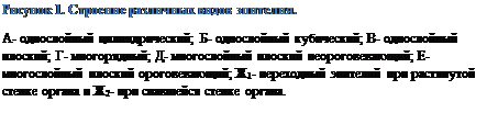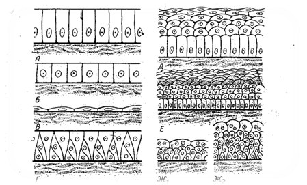 Однослойный, плоский эпителий состоит из плоских клеток расположенных на базальной мембране. Этот эпителий называется мезотелием и выстилает поверхность листков плевры, околосердечной сумки и брюшины. Эндотелий является производным мезенхимы и представляет собой непрерывный пласт плоских клеток, покрывающих внутреннюю поверхность кровеносных и лимфатических сосудов. Однослойный кубический эпителий выстилает канальцы почки, выводящие протоки желез. Однослойный цилиндрический эпителий состоит из клеток призматической формы. Этот эпителий выстилает внутреннюю поверхность желудка, кишечника, матки, яйцеводов, почечных канальцев. В кишечном эпителии встречаются бокаловидные клетки. Это одноклеточные железы выделяющие слизь. В тонкой кишке эпителиальные клетки имеют на поверхности особе образование – каемку. Она состоит из большого числа микроворсинок, что увеличивает поверхность клетки и способствует лучшему всасыванию питательных и других веществ. Клетки эпителия выстилающего матку имеют мерцательные реснички и называются мерцательным эпителием. Однослойный многорядный эпителий отличается тем, что клетки его имеют различную форму и вследствие этого их ядра лежат на разном уровне. Этот эпителий имеет мерцательные реснички и тоже называется мерцательным. Он выстилает воздухоносные пути и некоторые отделы половой системы. Движения ресничек удаляют частички пыли из верхних дыхательных путей. Многослойный плоский эпителий представляет собой сравнительно толстый пласт, состоящий из многих слоев клеток. С базальной мембраной соприкасается только самый глубокий слой. Многослойный эпителий выполняет защитную функцию и подразделяется на ороговевающий и неороговевающий. Неороговевающий эпителий выстилает поверхность роговицы глаза, полости рта и пищевода. Состоит из клеток разной формы. Базальный слой состоит из цилиндрических клеток; затем располагаются клетки разной формы с короткими толстыми отростками - слой шиповатых клеток. Самый верхний слой состоит из плоских клеток, постепенно отмирающих и отпадающих. Ороговевающий эпителий покрывает поверхность кожи и называется эпидермис. Он состоит из 4-5 слоев клеток разных по форме и выполняемым функциям. Внутренний слой, базальный, состоит из цилиндрических клеток, способных к размножению. Слой шиповатых клеток состоит из клеток с цитоплазматическами островками, при помощи которых клетки соприкасаются друг с другом. Зернистый слой состоит из уплощенных клеток, содержащих зернышки. Блестящий слой в виде блестящей ленты, состоит из клеток, границы которых не видны из-за блестящего вещества - элеидина. Роговой слой состоит из плоских чешуек, заполненных кератином. Самые поверхностные чешуйки рогового слоя постепенно отпадают, но пополняются за счет размножающихся клеток базального слоя. Роговой слой отличается устойчивостью к внешним, химическим воздействиям, упругостью и малой теплопроводностью, что обеспечивает выполнение защитной функции эпидермиса. Переходный эпителий характеризуется тем, что вид его изменяется в зависимости от состояния органа. Он состоит из двух слоев - базального- в виде мелких уплощенных клеток и покровного- крупных, слегка уплощенных клеток. Эпителий выстилает мочевой пузырь, мочеточники, лоханки, почечные чашечки. При со
