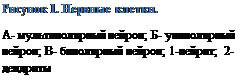 Нервные клетки имеют различную форму и величину и состоят из тела и отростков (рис.6). Отростки нервной клетки делятся на два типа: · Нейриты , или аксоны, по которым возбуждение (импульс) передается от тела клетки на периферию. Аксон всегда один отходит от клетки и заканчивается концевым аппаратом в рабочем органе или на другом нейроне. · Дендриты - отростки по которым с периферии к телу клетки передается импульс. Их много и они ветвятся. По количеству отростков нервные клетки делятся на три типа (рис.7): · Униполярные – клетки с одним отростком. У человека не обнаружены. · Биполярные – имеют один нейрит в ЦНС и один дендрит, идущий на периферию. Находятся в спинальных нервных узлах. · Мультиполярные – имеют один нейрит и много дендритов. Их у человека больше всего.