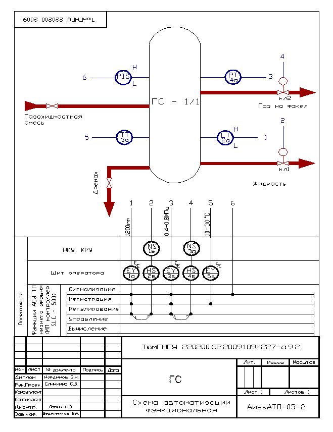 | Федеральное агенТство по образованию ГОСУДАРСТВЕННОЕ ОБРАЗОВАТЕЛЬНОЕ УЧРЕЖДЕНИЕ ВЫСШЕГО ПРОФЕССИОНАЛЬНОГО ОБРАЗОВАНИЯ "ТЮМЕНСКИЙ ГОСУДАРСТВЕННЫЙ НЕФТЕГАЗОВЫЙ УНИВЕРСИТЕТ" ИНСТИТУТ НЕФТИ И ГАЗА КАФЕДРА АВТОМАТИЗАЦИИ И УПРАВЛЕНИЯ ПОЯСНИТЕЛЬНАЯ ЗАПИСКА к выпускной работе по дисциплине «Проектирование микропроцессорных систем автоматизации» на тему: СИСТЕМА УПРАВЛЕНИЯ СЕПАРАТОРОМ НА ПРОМЫСЛОВОЙ КС Тюмень 2009 Реферат Пояснительная записка 45с., 5 рис., 10 табл., 10 источников, 5 прил. ГАЗОВЫЙ СЕПАРАТОР, СРЕДСТВА АВТОМАТИЗАЦИИ, ДАТЧИК, КОНТРОЛЛЕР, МОДУЛЬ, РЕГУЛИРОВАНИЕ, ДАВЛЕНИЕ, УРОВЕНЬ, ТЕМПЕРАТУРА, ИСПОЛНИТЕЛЬНЫЙ МЕХАНИЗМ. Объектом исследования является сепарационная установка первой ступени - ГС V 50м3 . Цель работы - разработка системы автоматизации ГС на компрессорной станции на базе программируемого логического контроллера SLC 500 фирмы Allen Bradley. В работе произведен выбор технических средств автоматизации, разработан алгоритм управления ГС и программно реализован для контроллера SLC 500, разработана схема внешних электрических соединений, произведен расчет системы автоматического регулирования давления газа в сепараторе. Содержание
