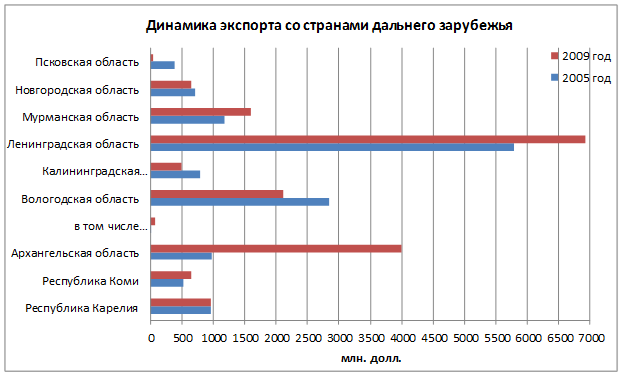 Как показывает таблица 2, величина внешнеторгового оборота РФ в 2009 году увеличилась в 1,4 раза (на 37,93%) по сравнению с 2005 годом. А именно, величина внешнеторгового оборота по Архангельской области возросла в 3,7 раза (на 269,64%). Преимущественно это связанно с ростом товарооборота со странами дальнего зарубежья, который повысился в 3,9 раза (на 287,69%), в то время как товарооборот со странами СНГ увеличился всего в 1,2 раза (на 22,61%). На рисунке 1 представлены данные областей по динамике экспорта со странами дальнего зарубежья. Как видно, Архангельская область в 2009 году занимает почетное второе место.