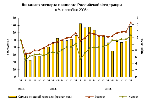 Если смотреть на долю внешнеторгового оборота области в стоимости внешнеторговых операций СЗФО и РФ, то здесь так же есть положительные моменты. Если в 2005 году доля в стоимости операций СЗФО составляла 3,02%, а в стоимости операций РФ 0,34%, то в 2009 году она составила уже 7,08% и 0,92% соответственно. Сальдо торгового баланса со странами ближнего и дальнего зарубежья можно охарактеризовать как отрицательное. Он снизился в 1,06 раза (почти на 6%). Однако для Архангельской области данный показатель является положительным. По данным таможенной статистики в 2010 году внешнеторговый оборот России составил 625,4 млрд.долларов США (с учетом данных о торговле с Республикой Беларусь и Республикой Казахстан) и по сравнению с 2009 годом возрос на 33,3%, в том числе, со странами дальнего зарубежья – 534,1 млрд.долларов США (рост на 33,4%), со странами СНГ – 91,3 млрд.долларов США (рост на 33,0%). Сальдо торгового баланса сложилось положительное в размере 167,5 млрд.долларов США, что на 33,2 млрд. долларов США больше, чем 2009 году. При этом в торговле со странами дальнего зарубежья сальдо равнялось 139,4 млрд.долларов США (рост на 30,1 млрд.долларов США), со странами СНГ – 28,1 млрд. долл. США (рост на 3,1 млрд.долларов США). На рисунке 2 представлены данные по объему внешней торговли РФ в 2009-2010 гг.