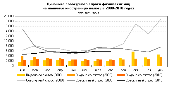 Спрос населения на американскую валюту в августе 2010 г. по сравнению с предыдущим месяцем уменьшился на 5%, на евро — почти не изменился. В результате структура совокупного спроса практически не претерпела изменений — доля долларов США снизилась до 63%, доля евро возросла до 36% (в июле 2010 г. — 64 и 35% соответственно). Объем купленной населением наличной иностранной валюты в обменных пунктах и операционных кассах уполномоченных банков в августе 2010 г. по сравнению с июлем практически не изменился и составил 3,5 млрд. долларов. Европейской валюты было куплено на 9% больше, чем месяцем ранее, объем покупки долларов США уменьшился на 3%. Количество операций по покупке физическими лицами наличной иностранной валюты по сравнению с предыдущим месяцем также почти не изменилось и составило 2,8 млн. сделок, средний размер сделки по покупке (1203 долл.) был больше на 1%.