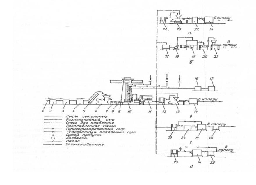 Содержание2. Технологические расчеты.. 12 3. Контроль производства и качества продукции. 23 Обзор литературы1.1 Виды продуктаНесмотря на обширность имеющегося ассортимента плавленых сыров (более 90 наименований, 6 видовых групп) происходит постоянное его обновление. С одной стороны, обновление ассортимента обусловливается необходимостью удовлетворения требования науки о питании и изменении потребительского спроса, а с другой — наличием сырьевых ресурсов и соображениями рентабельности того или иного вида сырья. Существенное влияние на ассортимент плавленых сыров оказывает необходимость продления сроков хранения, а также расширение области их применения. С учетом этого разрабатываются научные основы для создания технологии новых видов плавленых сыров с пониженным содержанием молочного жира, с полной или частичной заменой его жирами немолочного происхождения, а также технология плавленых сыров с длительными сроками хранения в нерегулируемых условиях. Плавленые сыры по пищевой ценности практически не уступают натуральным. Они содержат 20-60% молочного жира, полноценные белки, большое количество солей кальция и фосфора, имеют более широкую, чем натуральные, область применения. Пищевая ценность плавленых сыров обусловливается прежде всего белками. Содержание белков в плавленых сырах 20-25%. В их состав входят параказеин — 75-90%, казеин — 5-20% и сывороточные белки — до 5%. В связи с тем что плавленые сыры подвергаются тепловой обработке, они содержат меньшее количество микроорганизмов. В результате плавления сыры приобретают новые свойства: вкус может изменяться за счет внесения пищевых наполнителей, специй. При плавлении кроме вкусовых добавок можно вводить соки, витамины, различные наполнители и др. Плавленые сыры не имеют корки и стойки при хранении. В зависимости от вида основного сырья, технологии и химического состава и органолептических показателей плавленые сыры подразделяются на видовые группы: сыры плавленые ломтиевые; сыры плавленые колбасные; сыры плавленые пастообразные; сыры плавленые сладкие; сыры плавленые консервные; сыры плавленые к обеду. Вырабатывают плавленые сыры: ломтиевые, пастообразные, сладкие, к обеду различной жирности. Плавленые сыры отличаются также формой (бруски, секторы, цилиндры, полуцилиндры); консистенцией, которая бывает от плотной ломтевой до пастообразной; цветом — от слегка кремового до ярко-оранжевого и фисташкового; вкусом — от острого до сладкого; массой — от 30 до 250 г. Количество влаги в плавленых сырах колеблется от 35 до 60%, соли — от 2 до 4%. Сырьем для производства плавленых сыров служат: натуральные зрелые сыры; обезжиренный сыр-полуфабрикат; быстросозревающий сыр, предназначенный для плавления; жирный и обезжиренный творог; брынза и другие рассольные сыры; сухое и сгущенное молоко; масло сливочное и пластические сливки; пахта и сыворотка. Кроме того, применяют различные специи и пряности, пасту криля «Океан» и другие пищевые наполнители и ароматические добавки. Для плавления смеси применяют соли-плавители. С парафинированных сыров снимают парафин, бескорковые сыры зачищают и моют, далее измельчают на волочках до получения однородной массы с размером частиц 0,3-0,5 мм. Готовят смесь и выдерживают массу для созревания от 30 мин до 3 ч. Созревание улучшает консистенцию сырной масс