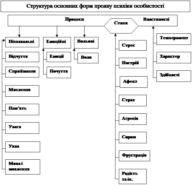 Рисунок 1 – Структура основних форм прояву психіки особистості Психічні процеси – різні форми єдиного, цілісного відображення людиною довкілля і себе в ньому. Психічні процеси поділяють на три основні групи: а) пізнавальні процеси – відчуття, сприймання, пам’ять, мислення, увага, уява, мовлення; б) емоційні – емоції, почуття; в) вольові – воля.Основні поняття і ключові слова: структура форм прояву психіки, психічні процеси (пізнавальні, емоційні, вольові), психічні стани, психічні властивості. 1.3.2 Пізнавальні процеси психіки особистості Пізнавальний процес – психічний процес, за допомогою якого людина пізнає світ. Пізнавальна діяльність – це процес відображення в мозку людини предметів та явищ дійсності. Вона складається із серії пізнавальних психічних процесів: відчуття, сприймання, уваги, пам’яті, уяви, мислення і мовлення. Відображення реальності в людській свідомості може відбуватися на рівні чуттєвого та абстрактного пізнання. Чуттєве пізнання характеризується тим, що предмети і явища об’єктивного світу безпосередньо діють на органи чуття людини – її зір, слух, нюх, тактильні та інші аналізатори і відображаються у мозку. До цієї форми пізнання дійсності належать пізнавальні психічні процеси відчуття та сприймання. Вищою формою пізнання людиною є абстрактне пізнання, що відбувається за участю процесів мислення та уяви. У розвиненому вигляді ці пізнавальні процеси властиві тільки людині, яка має свідомість і виявляє психічну активність у діяльності. Істотною особливістю мислення та уяви є опосередкований характер відображення ними дійсності, зумовлений використанням раніше здобутих знань, досвіду, міркуваннями, побудовою гіпотез тощо. Об’єктом пізнання у процесах мислення та уяви є внутрішні, безпосередньо не дані у відчуттях об’єкти, закономірності явищ та процесів. Важливу роль у пізнавальній діяльності людини відіграє пам’ять, яка своєрідно відображає, фіксує й відтворює те, що відбивається у свідомості у процесі пізнання. Важливою характеристикою пізнавальної діяльності є емоційні та вольові процеси, які спонукають особистість до активних дій, вольових актів. Пізнання предметів та явищ об’єктивної дійсності, психічного життя людини здійснюється всіма пізнавальними процесами. Підґрунтям розумового пізнання світу, яким би складним воно не було, є чуттєве пізнання. Разом з тим сприймання, запам’ятовування, відтворення та інші процеси неможливі без розумової діяльності, переживань та вольових прагнень. Але кожний з цих процесів має певні закономірності й постає у психічній діяльності або як провідний, або як допоміжний. Основні поняття і ключові слова: пізнавальна діяльність, пізнавальні процеси (відчуття, сприймання, мислення, пам’ять, увага, уява, мова і мовлення), емоційні процеси (емоції, почуття), вольові процеси (воля), чуттєве пізнання, абстрактне пізнання. 1.3.3 Відчуття, сприймання як початкові рівні пізнання Пізнання відбувається на чуттєвому та абстрактному рівнях. При чуттєвому пізнанні предмети і явища об’єктивного світу безпосередньо діють на органи чуттів людини – її зір, слух, нюх, тактильні, смакові та інші аналізатори і відображаються в мозку. До цієї форми пізнання належать пізнавальні психічні процеси відчуття і сприймання. Відчуття і сприймання несуть інформацію про зовнішні 