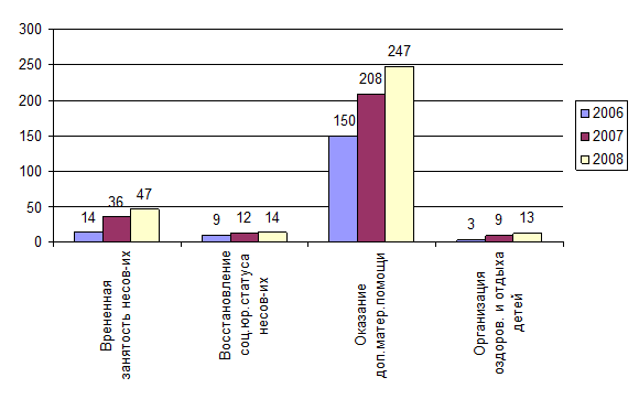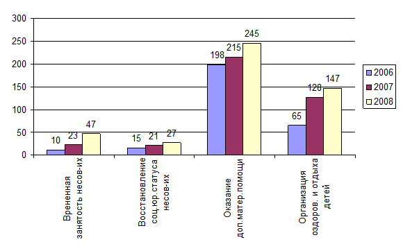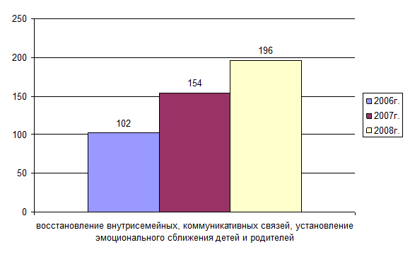 Трудовая реабилитация детей реализовывалась через включение их в разнообразные виды деятельности ЦСПД (субботники по уборке территории, ремонт мебели, сбор вещей для пункта приема и др.); содействие профессиональной ориентации и получение специальности. В результате посреднической деятельности социального педагога, временная занятость несоверщеннолетних в каникулярное время составила в 2006 году 10 человек; в 2007 - 23; в 2008 - 47 человек. Через Центр занятости на неквалифицированные работы было устроено в 2008 году 47 родителей, тогда как в 2006 -только 14. человек. О восстановление социально-юридического статуса семьи, заключающегося в восстановлении утраченных документов (свидетельство о рождении ребенка, договор или ордер на квартиру, паспорт и др.), свидетельствуют такие цифры - для детей: в 2006 году -15 ; в 2007 - 21; в 2008 году - 27 человек); для родителей: в 2006 году - 9; в 2007 -12; в 2008 -14. В результате деятельности социального педагога с семьей по социально-педагогической программе «Выездная реабилитация», предполагающей организацию летнего отдыха детей, организацию экскурсионных автобусных и теплоходных тематических поездок, в течение 2006 года на отдых было отправлено 65 детей из неблагополучных семей, в 2007 - 128; в 2008 году - 147 детей, что составляет в процентном отношении соответственно: 13%, 26% и 30% от общего количества детей в неблагополучных семьях. Материальной помощью воспользовались в 2006 году 150 семей, в 2007 -208, в 2008 году - 247 семей, что составляет 50%, 60% и 80% от общего количества неблагополучных семей. Дополнительная материальная помощь ребенку (питание, одежда, учебники, лекарства, канцелярские товары и др.) была оказана в 2006 году 198 детям, в 2007 - 215, в 2008 году - 245 детям. Жилищные условия улучшились в 2006 году у 9 семей, в 2007 и 2008 соответственно у 12 и 14. Оказание своевременной социально-экономической помощи неблагополучной семье снизило остроту тяжести материального положения, что способствовало повышению социально-экономического статуса семей и уровня социально-экономической адаптации родителей и детей. В качестве критерия социально-психологического статуса неблагополучной семьи было выбрано восстановление внутрисемейных, коммуникативных связей, установление эмоционального сближения детей и родителей, о чем свидетельствуют данные диаграммы 2. Диаграмма 2 Динамика социально-психологического статуса