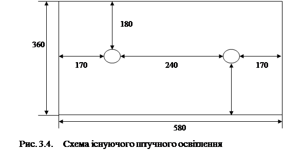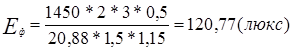де F – світловий потік лампи. Лампа потужністю 100 Вт створює світловий потік у 1450 лм (F = 1450 лм); S – площа приміщення, м2 ; Z – коефіцієнт нерівномірності освітлення, для ламп розжарювання складає 1,15; N – кількість світильників, шт. (N = 2); n – кількість ламп у світильнику, шт. (n = 3); К – коефіцієнт запасу, К = 1,5–2;