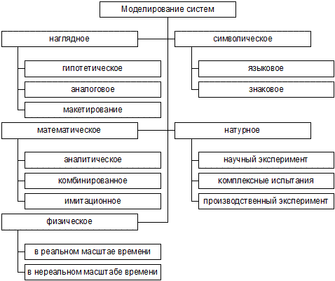 Мысленное моделирование применяется тогда, когда модели не реализуемы в заданном интервале времени либо отсутствуют условия для их физического создания (например, ситуации микромира). Мысленное моделирование реализуется в виде наглядного, символического и математического. 1) При наглядном моделировании на базе представлений человека о реальных объектах создаются наглядные модели, отображающие явления и процессы, протекающие в объекте. В основу гипотетического моделирования закладывается гипотеза о закономерностях протекания процесса в реальном объекте, которая отражает уровень знаний исследователя об объекте и базируется на причинно-следственных связях между входом и выходом изучаемого объекта. Этот вид моделирования используется, когда знаний об объекте недостаточно для построения формальных моделей. Аналоговое моделирование основывается на применении аналогий различных уровней. Для достаточно простых объектов наивысшим уровнем является полная аналогия. С усложнением системы используются аналогии последующих уровней, когда аналоговая модель отображает несколько либо только одну сторону функционирования объекта. Макетирование применяется, когда протекающие в реальном объекте процессы не поддаются физическому моделированию либо могут предшествовать проведению других видов моделирования. В основе построения мысленных макетов также лежат аналогии, обычно базирующиеся на причинно-следственных связях между явлениями и процессами в объекте. 2) Символическое моделирование представляет собой искусственный процесс создания логического объекта, который замещает реальный и выражает основные свойства его отношений с помощью определенной системы знаков и символов. В основе языкового моделирования лежит некоторый тезаурус, который образуется из набора входящих понятий, причем этот набор должен быть фиксированным. Между тезаурусом и обычным словарем имеются принципиальные различия. Тезаурус — словарь, который очищен от неоднозначности, т. е. в нем каждому слову может соответствовать лишь единственное понятие, хотя в обычном словаре одному слову может соответствовать несколько понятий. Если ввести условное обозначение отдельных понятий, т. е. знаки, а также определенные операции между этими знаками, то можно реализовать знаковое моделирование и с помощью знаков отображать набор понятий — составлять отдельные цепочки из слов и предложений. Используя операции объединения, пересечения и дополнения теории множеств, можно в отдельных символах дать описание какого-то реального объекта. 3) Математическое моделирование — это процесс установления соответствия данному реальному объекту некоторого математического объекта, называемого математической моделью. В принципе, для исследования характеристик процесса функционирования любой системы математическими методами, включая и машинные, должна быть обязательно проведена формализация этого процесса, т. е. построена математическая модель. Исследование математической модели позволяет получать характеристики рассматриваемого реального объекта. Вид математической модели зависит как от природы реального объекта, так и от задач исследования объекта, требуемой достоверности и точности решения задачи. Любая математическая модель, как и всякая другая, оп