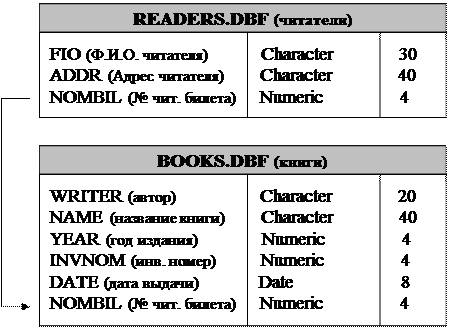 Здесь обе базы данных проиндексированы и связаны по полю NOMBIL, причем одной записи базы данных READERS могут соответствовать несколько записей из базы данных BOOKS (связь «одна-со-многими). Рисунки, отображающие внешний вид экранных форм и меню