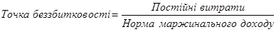 Зіставляючи структуру продукції, стає очевидним, що збільшилася частка продукції з низькою величиною маржинального доходу, у зв'язку з чим у підприємства знизився прибуток на 2004 грн. (24000 - 26000). Точка беззбитковості після змін, що відбулися в асортименті, буде наступною: (15 х 2х) + 12х - (10 х 2х) - 8х - 15000 = 0; 3,0х + 12х - 20х - 8х -15000 = 0; 14х = 15000 од; х = 15000 : 14 = 1071,4 од. (ІРС); 1071,4 х 2 = 2142,8 од. (FEC); Усього: 1071,4 + 2142,8 = 3214,2 од. Приведені дані свідчать, що в цілому по підприємству точка беззбитковості (поріг рентабельності) буде дорівнює 3214,2 од., з них 1071,4 од. контролерів ІРС і 2142,8 контролерів FEC. Порівнюючи результат з попереднім розрахунком відзначаємо, що точка беззбитковості (поріг рентабельності) знизилася на 160,8 од. (3214,2 - 3375). При цьому звертає на себе увага той факт, що обсяг реалізації в натуральному вираженні залишився без зміни (9000 од.). Отже, навіть при контролі загального обсягу продажів необхідний аналіз структурних змін в асортименті продукції, що випускається, тому що він дає картину відхилень фактичного прибутку від запланованого. Різновидом методу рівнянь є метод маржинального доходу, при якому крапка беззбитковості (поріг рентабельності) визначається по наступній формулі: Як знайти крапку беззбитковості розглянемо на прикладі. Приклад 7. Аналізуємо реалізацію ДП „Арго” контролерів FEC. Нижче приведені дані, що характеризують діяльність підприємства: · Виручка від реалізації - 75 000 грн. · Перемінні витрати - 50 000 грн. · Постійні витрати - 15 000 грн. · Прибуток - 10 000 грн. · Обсяг виробленої продукції, 5000 од. · Ціна одиниці 15 грн. Щоб знайти точку беззбитковості (поріг рентабельності), необхідно відповісти на питання: до якого рівня повинна упасти виручка підприємства, щоб прибуток став нульовий? Не можна просто скласти перемінні і постійні витрати, тому що при зниженні виручки перемінні витрати також знизяться. У цьому випадку послідовність розрахунків для перебування точки беззбитковості (граничного виторгу) буде наступною: Знаходимо величину маржинального доходу 75000 грн. - 50000 грн. = 25000 грн. Обчислюємо норму маржинального доходу 25000 грн. : 75000 грн. = 0,33 Визначаємо точку беззбитковості (граничний виторг) у вартісному вираженні 15000 грн. : 0,33 = 45455 грн. Визначаємо точку беззбитковості (поріг рентабельності) у натуральному вираженні 45445 грн. : 15 грн. = 3030 од. Маржинальний запас міцності - це величина, що показує перевищення фактичної виручки від реалізації продукції (робіт, послуг) над граничною, що забезпечує беззбитковість реалізації. Цей показник визначається наступною формулою: