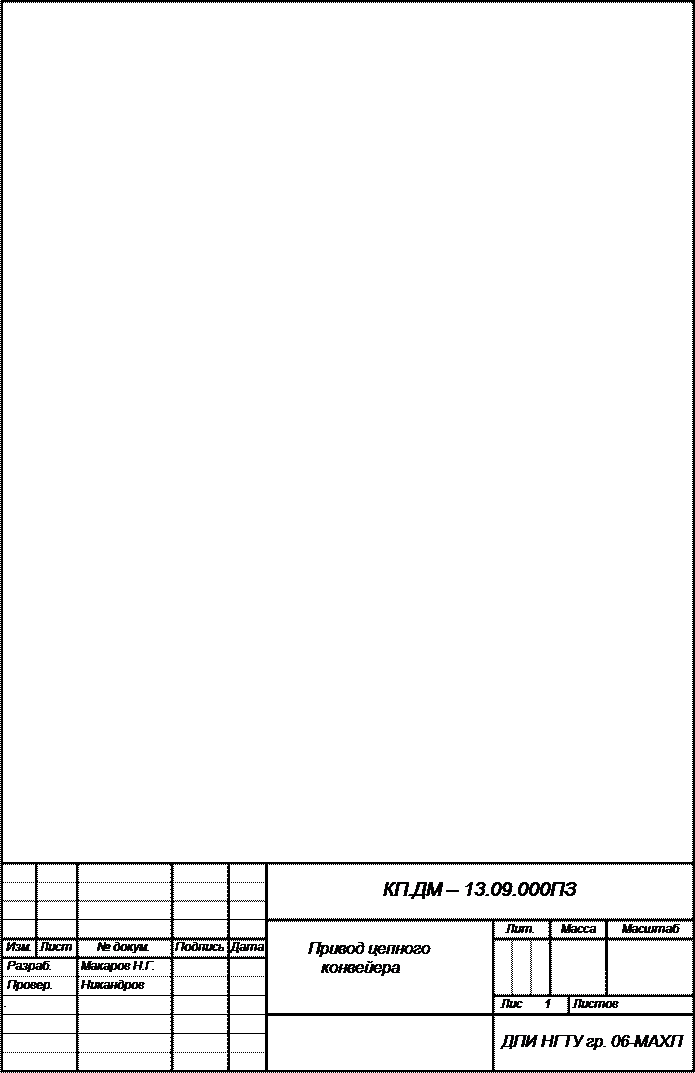 | Федеральное агентство по образованию Государственное образовательное учреждение высшего профессионального образования НИЖЕГОРОДСКИЙ ГОСУДАРСТВЕННЫЙ ТЕХНИЧЕСКИЙ УНИВЕРСИТЕТ ИМ. Р.Е. АЛЕКСЕЕВА Дзержинский политехнический институт Кафедра Автомобильный транспорт и механикаЗаведующий кафедрой __________________ ____Кулепов В.Ф. ____ (подпись) (фамилия, и. о.) _______________________ (дата) Привод цепного конвейера (наименование темы или проекта) ПОЯСНИТЕЛЬНАЯ ЗАПИСКА к курсовой работе по дисциплине “Детали машин” (вид документа – проект дипломный, курсовой, исследовательская работа или часть и т.п.) РУКОВОДИТЕЛЬ ________________________ _________________________ (подпись) (фамилия, и., о.) _____________________________ (дата) СТУДЕНТ ________________________ _______________________ (подпись) (фамилия, и., о.) __________________________ (дата) ______________________________ (группа или шифр) Работа защищена ___________________ (дата) С оценкой ___________________________ 2009 г.