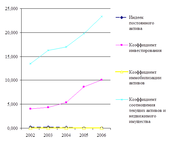 Первое условия: А1 ≥ П1 выполняется только в 2006 году, это связано с тем, что у предприятия появились денежные средства и их стало хватать на покрытие наиболее срочных обязательств. В 2002-2005 годах это условие не выполнялось, т.к. у предприятия не хватало денежных средств. Второе условие: А2 ≥ П2 выполняется только в 2005 году, т.к. у предприятия отсутствовали краткосрочные обязательства. В 2002,2003,2004,2006 годах условия не выполнялось из-за нехватки средств на покрытие краткосрочных обязательств. Третье условие: А3 ≥ П3 выполняется на протяжении всего периода, т.к. у предприятия отсутствуют долгосрочные обязательства. Четвертое условие: выполняется на протяжении всего рассмотренного периода, т.е. у предприятия хватает трудно реализуемых активов на покрытие постоянных пассивов. Таким образом, у предприятия наблюдается острая нехватка ликвидных средств. Для решения этой проблемы предприятию необходимо проводить работу с дебиторами по погашению задолженности, переводить запасы в денежные средства и эквиваленты Проведем оценку финансовой устойчивости предприятия (таблица 10) Коэффициент инвестирования – это способность собственного капитала формировать, финансировать внеоборотные активы. На предприятии Кинв возрос, на протяжении рассмотренного периода он выше 1,0. Следовательно, предприятию хватает собственного капитала для финансирования внеоборотных активов. При этом значение показателя за 2006г. составляют 10,095, что выше, чем в 2004 году на 1,9 %. Индекс постоянного актива – это величина обратная коэффициенту инвестирования, т.е. имеет противоположную тенденцию. Если К>1, это свидетельствует о том, что даже внеоборотные активы финансируются за счет краткосрочных заемных средств, а оборотные активы – только за счет заемных средств, что очень рискованно, т.е. К>1, то у предприятия нет СОС. Чем ниже этот показатель, тем лучше для предприятия. На предприятии ООО «Персона» этот показатель снижается к 2006г. на 60%. Коэффициент иммобилизации активов показывает соотношение внеоборотных и оборотных активов. Показывает, что на каждый рубль оборотных активов предприятие имеет 1 рубль денежных средств, вложенных в основные средства. В динамике показатель снижается: 2002 г – 0,074, 2003 – 0,062, 2004г. – 0,059, в 2005г. – 0,05, в 2006г.- 0,042. Коэффициент соотношения текущих активов и недвижимого имущества показывает, сколько приходится оборотных средств на 1 рубль недвижимого имущества: 2002 – 13,5, 2003 – 16,24, в 2004г. – 16,945, в 2005г. – 19,764, в 2006г. –0,23,329. Таблица 10 - Оценка состояния основного имущества предприятия ООО «Персона»