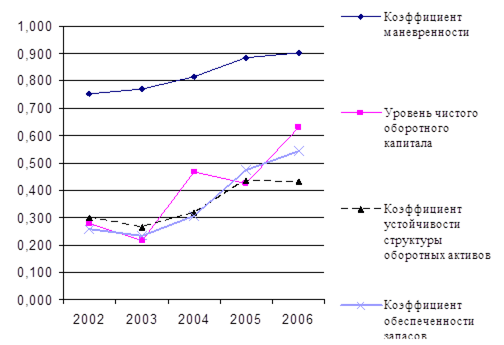 Рисунок 8 - Динамика коэффициентов, характеризующих состояние оборотного имущества предприятия ООО «Персона» Коэффициент маневренности показывает, какую часть собственных оборотных средств сформировано за счет собственного капитала предприятия. На предприятии данные коэффициенты составляют, в 2002 г. – 0,75, в 2003 – 0,77 в 2004г.- 0,814, в 2005г. - 0,884, в 2006г. – 0,901. Наблюдается тенденция к росту, т.е. увеличивается доля собственного капитала, который используется для финансирования текущей деятельности. Коэффициент устойчивости структуры оборотных активов показывает, какую долю составляют собственные оборотные средства в текущих активах предприятия. Данный показатель растет (2002 – 0,301, 2003 – 0,266, 2004г.-0,317, 2005г. – 0,437, 2006г.- 0,433) , это свидетельствует о наличии у предприятия собственных средств, необходимых для его финансовой устойчивости. В нормативно-правовых документах, связанных с банкротством российских предприятий коэффициент составляет 0,10. Коэффициент обеспеченности запасов собственными средствами характеризует наличие собственных оборотных средств, необходимых для финансовой устойчивости предприятия. Данный показатель растет и имеет положительное значение. Это говорит о том, что у предприятия есть возможность в проведении независимой от кредиторов финансовой политики. Проведем оценку рыночной устойчивости ООО «Персона» (таблица 12) Изобразим графически данные таблицы 12