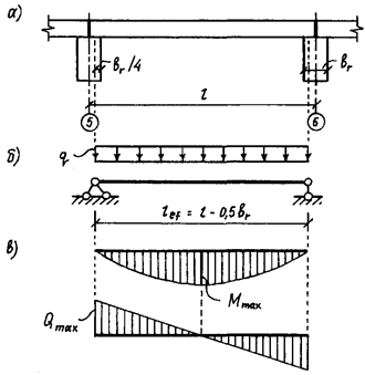 где b r – ширина ригеля 2.1.2. Расчётная нагрузка · Панель воспринимает нагрузку, действующую в пределах её номинальной ширины b п = 1,1м . · Полная расчетная нагрузка на панель · q = Р 0 bn gn = 9,03*1,5*×0,95 = 12,868кН /м . 2.1.3. Внутренние усилия в панели Наибольшие внутренние усилия в панели перекрытия при действии полной расчётной нагрузки вычисляются по формулам сопротивления материалов (рис. 2.1, в): · изгибающий момент (в середине пролёта):