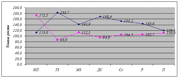 То есть выполняются неравенства: для 2007 года: 113,0 < 119,5 < 141,9 < 143,6 < 153,1 < 168,4 < 183,7 для 2008 года: 86,9 < 94,8 < 104,3 < 105,7 < 110,0 < 112,5 < 172,5 Теперь сравним фактические результаты с нормативным рядом: - нормативный ряд: Тнр < Ттз < Тмз < Тдс < Тсс < Тр < Тп - ряд 2007 года: Тнр < Тп < Тмз < Тр < Тсс < Тдс < Ттз - ряд 2008 года: Ттз < Тдс < Тcc < Тр < Тп < Тмз < Тнр Как мы видим, в фактическом ряду 2007 года темп роста трудовых затрат превышает темпы роста всех остальных показателей, тогда как в 2008 году этот показатель, напротив, по темпам роста находится ниже всех остальных. Это может свидетельствовать о нерациональном использовании трудовых ресурсов, о кризисе системы управления. Косвенно об этом может свидетельствовать и вариативность показателя темпов роста нереализованной продукции, который в 2007 году самый низкий, а в 2008 году — наоборот, самый высокий.
