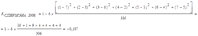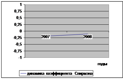 где n – количество рангов в ряду (в нашем случае n=7). Этот коэффициент обладает следующими свойствами: - при полном соответствии двух последовательностей (нормативной и фактической), т.е. каждый показатель занимает одно и то же место в обоих рядах), он равен +1, что означает полную положительную корреляцию. Цели предприятия в анализируемом году достигнуты полностью. - при полной отрицательной зависимости, т.е. если в одной последовательности показатели расположены в обратном порядке по сравнению с другой, он равен –1, что означает полную отрицательную корреляцию. Руководство предприятия не достигло поставленных целей. - в остальных ситуациях значение коэффициента находится между двумя предельными значениями. Можно утверждать, что возрастание значения коэффициента от – 1 до +1 характеризует увеличивающееся соответствие между двумя последовательностями в сторону повышения результативности управленческой деятельности. Определим фактические динамические ряды для каждого года анализируемого периода и рассчитаем коэффициент Спирмэна. Результаты расчета представим в табл. 2.3. Таблица 2.3 Фактические динамические ряды предприятия за 2007-2008 гг.