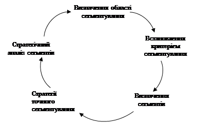 Рис. 1.2. Етапи ринкової сегментації Після того, як область сегментації визначена, необхідно встановити один або декілька критеріїв сегментації ринку [19]. Ринкова сегментація здійснюється шляхом дроблення ринку (області сегментації) на окремі сегменти згідно одному або декільком критеріям. Як такі часто використовуються демографічні і психографічні характеристики споживачів (спосіб життя, соціальні орієнтири). Інформація про ці характеристики міститься в звітах перепису населення і багатьох інших джерел. Виділяють наступні критерії сегментації: Сегментація за способом використання товару поділяє споживачів згідно різним ситуаціям використання товару. Сегментація згідно потребам і перевагам враховує відношення споживачів до товару, ступінь їх обізнаності про торгову марку, а також їх переваги в бік тієї або іншої торгової марки. Сегментація за особливостями купівельної поведінки акцентує свою увагу на таких особливостях споживання, як обсяг і частота покупок [6,10]. Характеристики кінцевих споживачів: 1. Ринок фізичних осіб. Фізичні особи володіють двома основними характеристиками: o географічними і демографічними o психографічними. Демографічні характеристики існують для опису вже виділених сегментів, ніж є критерієм для їх визначення. Проте, вони є загальновизнаними, оскільки демографічні дані часто безпосередньо пов'язані з іншими критеріями сегментації. Територіальне місцеположення також враховується в процесі ринкової сегментації. Демографічні характеристики враховують вік, дохід, освіту, рід занять і багато інших атрибутів фізичних осіб. Ці дані незамінні для опису споживчих сегментів. При сегментації ринку, виборі каналів розподілу, розробці стратегій просування товару і ухваленні інших стратегічних маркетингових рішень доцільно використовувати демографічні дані в поєднанні з інформацією про купівельну поведінку. Психографічні характеристики описують інтереси людей, їх думки і купівельні звички. Вони доповнюють демографічні дані, даючи більш повне уявлення про споживача. Психографічні характеристики допомагають створити профілі споживачів. Ця інформація використовується при сегментації ринку, позицію ванні товарів і розробці рекламних звернень. 2. Корпоративний ринок. При сегментації корпоративного ринку використовуються деякі з його характеристик. Так, тип галузі зумовлює покупку певних видів товарів. До інших критеріїв сегментації корпоративного ринку відносяться розмір компанії, цикл розвитку галузі, а також положення компанії в ланцюжку створення цінності (виробник, оптовий торговець, роздрібний торговець). При сегментації корпоративного ринку необхідно врахувати два показники: величину ринкової концентрації ступінь індивідуалізації товару. Величина концентрації відображає кількість споживачів даного ринку і їх відносну купівельну спроможність. Ступінь індивідуалізації товару демонструє, якою мірою необхідно пристосовувати товар під потреби кожного кінцевого споживача. 1.2.2. Методи визначення сегментів і види сегментації Існує два методи визначення ринкових сегментів: Агрупування споживачів згідно їх описовим характеристикам з подальшим співставленням ступеня сприйнятливості цих груп Бформування сегментів на підставі відмінностей в сприйнятливості (наприклад частота 