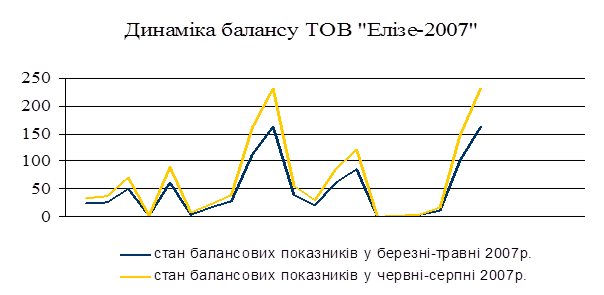 Баланс фірми представлений у додатку Б. Незважаючи на те, що ТОВ «Елізе-2007» нещодавно вийшла на ринок будівельних матеріалів аналіз динаміки балансу вказує на значне збільшення всіх показників щодо перших трьох місяців існування фірми на даному ринку. Графічне відображення динаміки балансу ТОВ «Елізе-2007» представлене на рис. 2.2. В майбутньому, при збереженні аналогічних темпів зростання балансових показників, ТОВ «Елізе-2007» матиме змогу не тільки одержати значну перевагу над основними конкурентами, а й вийти на більш високий рівень у своїй діяльності.