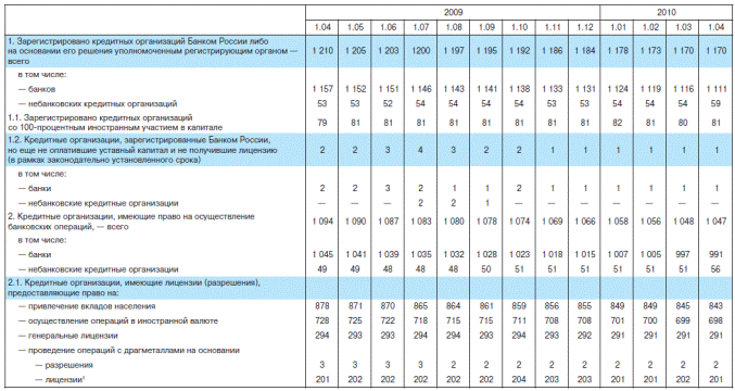 Таблица 1 характеризует динамику количества и структуры кредитных организаций России за истекший год. Таблица 1 – Количество и структура кредитных организаций по состоянию на 2009-2010 гг (Бюллетень банковской статистики № 4 (203))