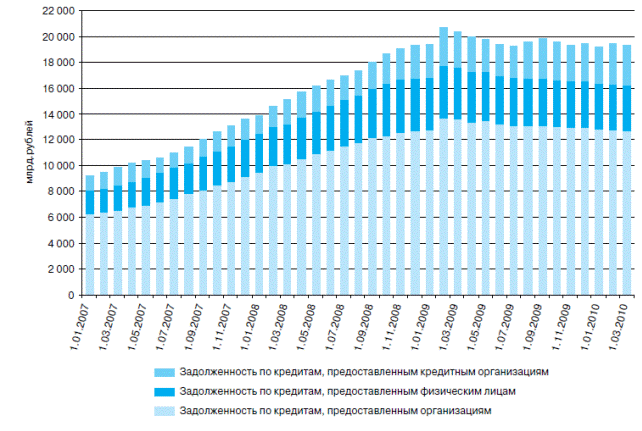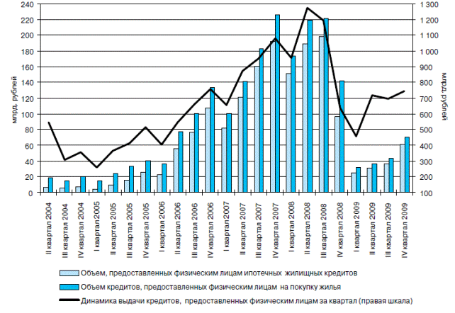 Рис. 1 - Динамика выдачи кредитов, предоставленных кредитными организациями физическим лицам, за квартал (Бюллетень банковской статистики № 4 (203)) На динамику банковских кредитов в 2008-2009 гг. оказало влияние то, что в период кризиса многие организации начали сворачивать инвестиционные программы, сокращать текущие расходы. Банки стали ужесточать требования к финансовому состоянию граждан в связи с возрастающими рисками непогашения кредитов (снижение покупательской способности, увеличение числа безработных). В ближайшее время банкам придется больше внимания уделять привлечению ресурсов с внутреннего рынка. В-третьих, ухудшается качество кредитного портфеля.