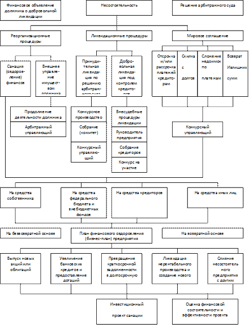 Содержание Введение Глава 1.Теоретические основы механизма несостоятельности (банкротства) хозяйствующего субъекта 1.1 Определение понятия "банкротство", причины и виды банкротства предприятий 1.2 Основные процедуры банкротства и формы их реализации 1.3 Методики прогнозирования банкротства предприятия 1.4 Основные этапы программы финансового оздоровления 1.5 Сущность, принципы и содержание политики антикризисного управления предприятием Глава 2. Анализ финансового состояния и диагностика возможного банкротства предприятия – зао "проминтегр" 2.1 Информация о предприятии и характеристика его основных рынков 2.2 Анализ финансового состояния ЗАО "ПромИнтегр" 2.3 Диагностика банкротства ЗАО "ПромИнтегр" с использованием различных методик Глава 3. План финансового оздоровления ЗАО "Проминтегр" 3.1 Структура мероприятий по финансовому оздоровлению 3.2 План производства 3.3 Финансовый план и финансовая стратегия 3.4 Сравнительный анализ данных бухгалтерского баланса Заключение Список использованных источников Приложения Как свидетельствует мировая практика, возможность банкротства – неизбежное явление любого современного рынка, в котором несостоятельность является рыночным инструментом перераспределения капитала и отображает объективные процессы в структурной перестройке экономике. Предпосылки банкротства следует рассматривать как взаимодействие целого ряда причин, одни из которых являются внешними по отношению к предприятию, и на них у предприятия нет практических возможностей влиять, или это влияние может быть слабым. Другие причины носят внутренний характер. Как правило, группа внутренних причин непосредственно зависит от организации работы на самом предприятии. Современное состояние большинства хозяйствующих субъектов таково, что первоочередными тактическими задачами для них является реактивная форма управления и недопущение банкротства. Подобный подход не позволяет достичь устойчивой работы предприятия в долгосрочной перспективе. Потому особое значение в сегодняшних условиях приобретает формирование эффективного механизма управления предприятиями, основанного на анализе финансово-экономического состояния, с учетом постановки стратегических целей деятельности, адекватных рыночным условиям и поиска путей их достижения. Данный подход неразрывно связан с антикризисным управлением. Это словосочетание прочно вошло в оборот теоретиков и практиков, решающих проблемы управления предприятием. Актуальность данной дипломной работы вызвана самой актуальностью прогнозирования банкротства для предприятий, вынужденных выживать в условиях рыночной экономики. Целью данной дипломной работы является проведение комплекса мероприятий по прогнозированию банкротства и разработка рекомендаций в области антикризисного управления на предприятии. Для реализации поставленной цели в дипломной работе поставлены и решаются следующие взаимосвязанные задачи: 1) изучение понятия, видов и процедур банкротства; 2) рассмотрение сущности и принципов политики антикризисного управления предприятием в современных условиях; 3) анализ содержания основных этапов политики антикризисного управления предприятием; 4) диагностика финансового состояния предприятия, включая проведение анализа ликвидности и платежеспособност