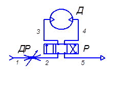 Рис. 1. Принципиальная гидравлическая схема привода рабочего органа станка для осуществления вертикальной подачи сверлильной головки. 2.3.2. Для движения L 2 (поворотный гидродвигатель): Необходимое количество дросселирующих аппаратов уже определено ранее: дросселей – 1 шт. Покажем путь масла от напорной линии (поз. 1) до сливной (поз. 5) для каждого из участков циклограммы. Участок 1 (С – стоп): масло к гидродвигателю не поступает. Участок 2 (БВ – быстро вперед): 1 – ДР – 2 – Р – 3 – Д – 4 – Р – 5. Участок 3, 4, 5, 6 (С – стоп): масло к гидродвигателю не поступает. Участок 7 (БН – быстро назад): 1 – ДР – 2 – Р – 4 – Д – 3 – Р – 5. Участок 8, 9, 10, 11 (С – стоп): масло к гидродвигателю не поступает.
