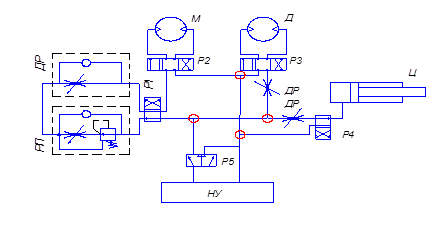 Рис. 3. Принципиальная гидравлическая схема привода рабочего органа станка для осуществления фиксации стола.