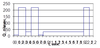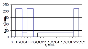 где: Fн i – площадь поршня в напорной линии, мм2 ; Vi – линейная скорость движения рабочего органа станка, мм/мин; По полученным значениям строим циклограммы подачи масла, сначала отдельно для каждого гидродвигателя, затем суммарную.